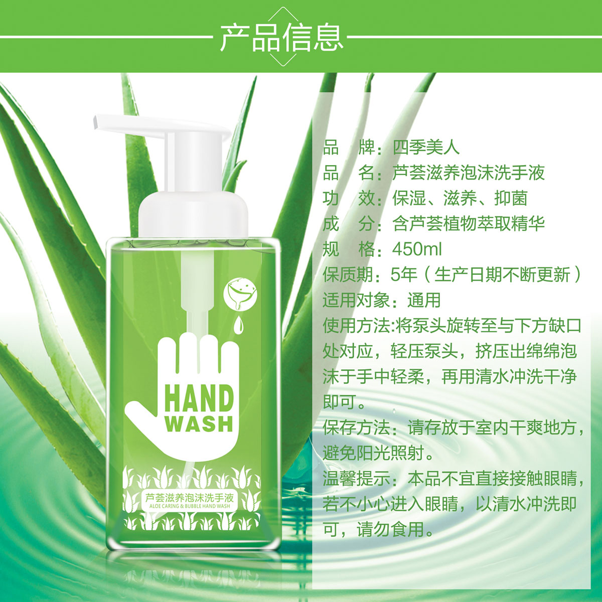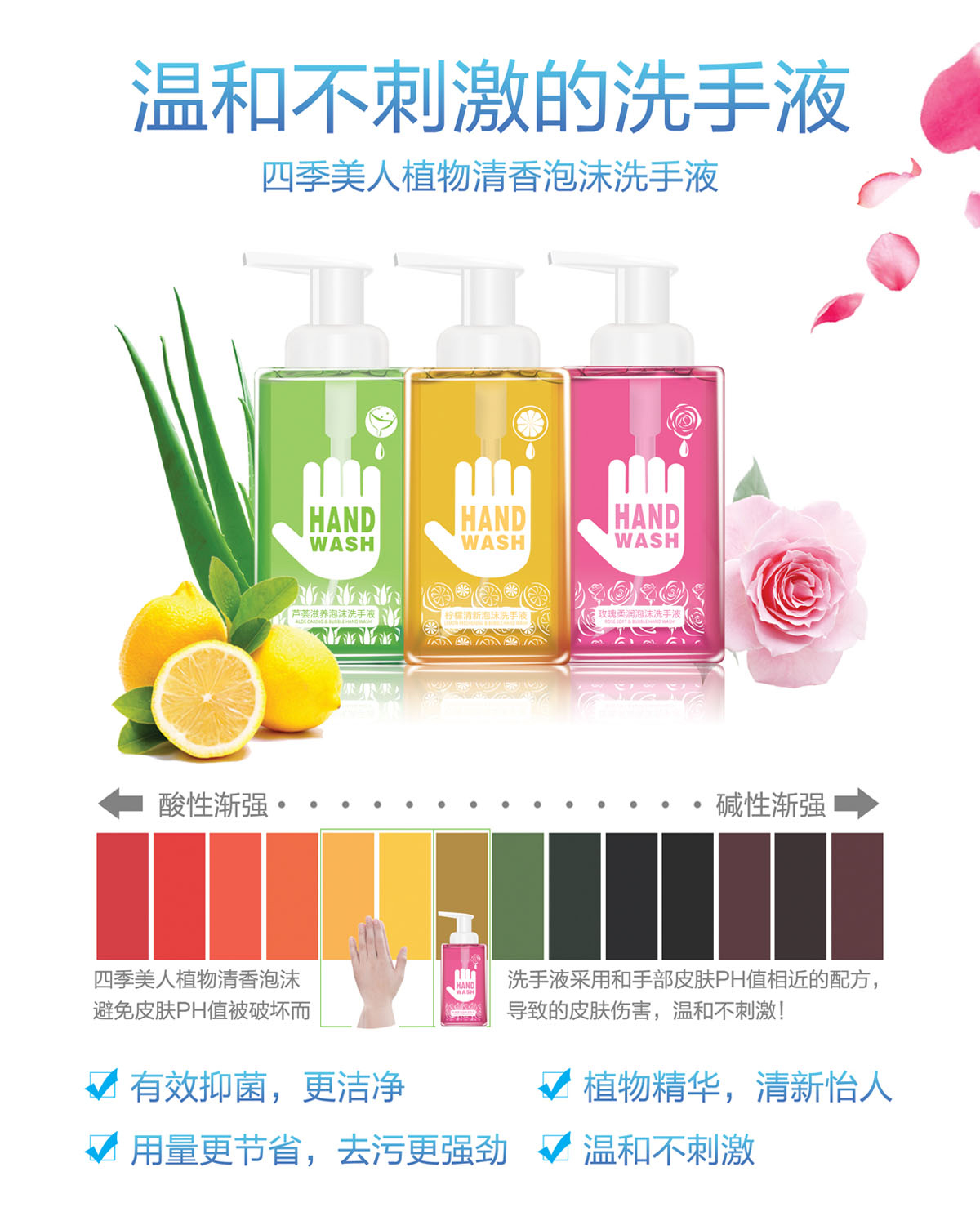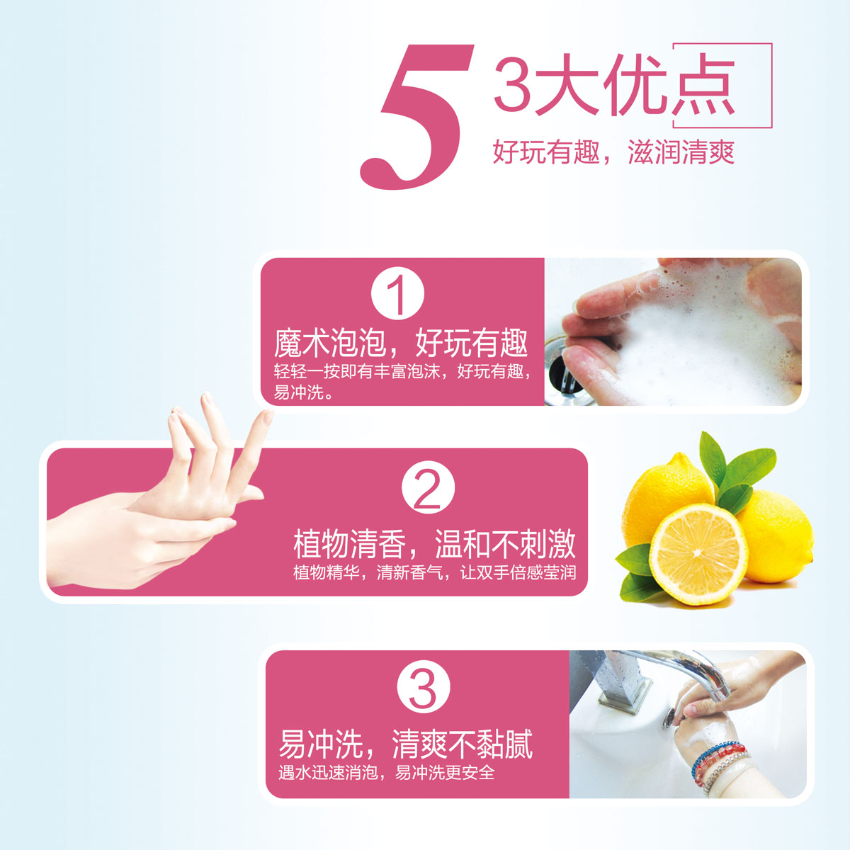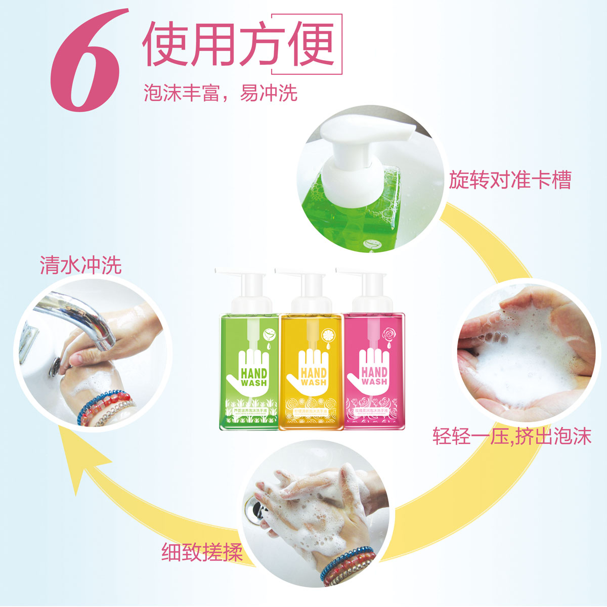 *温和洁净配方,温和去除手部污垢及油脂,令双手清新爽洁; *蕴含玫瑰提取精华,在清洁双手的同时有效滋养及润滑双手,泡沫丰富易冲洗,温馨浪漫的玫瑰花香有助去除手上的异味; *选用泡沫型的卫生泵头,按出丰富细密的泡沫,好玩有趣,易冲洗,使用更方便,适合全家每天使用。