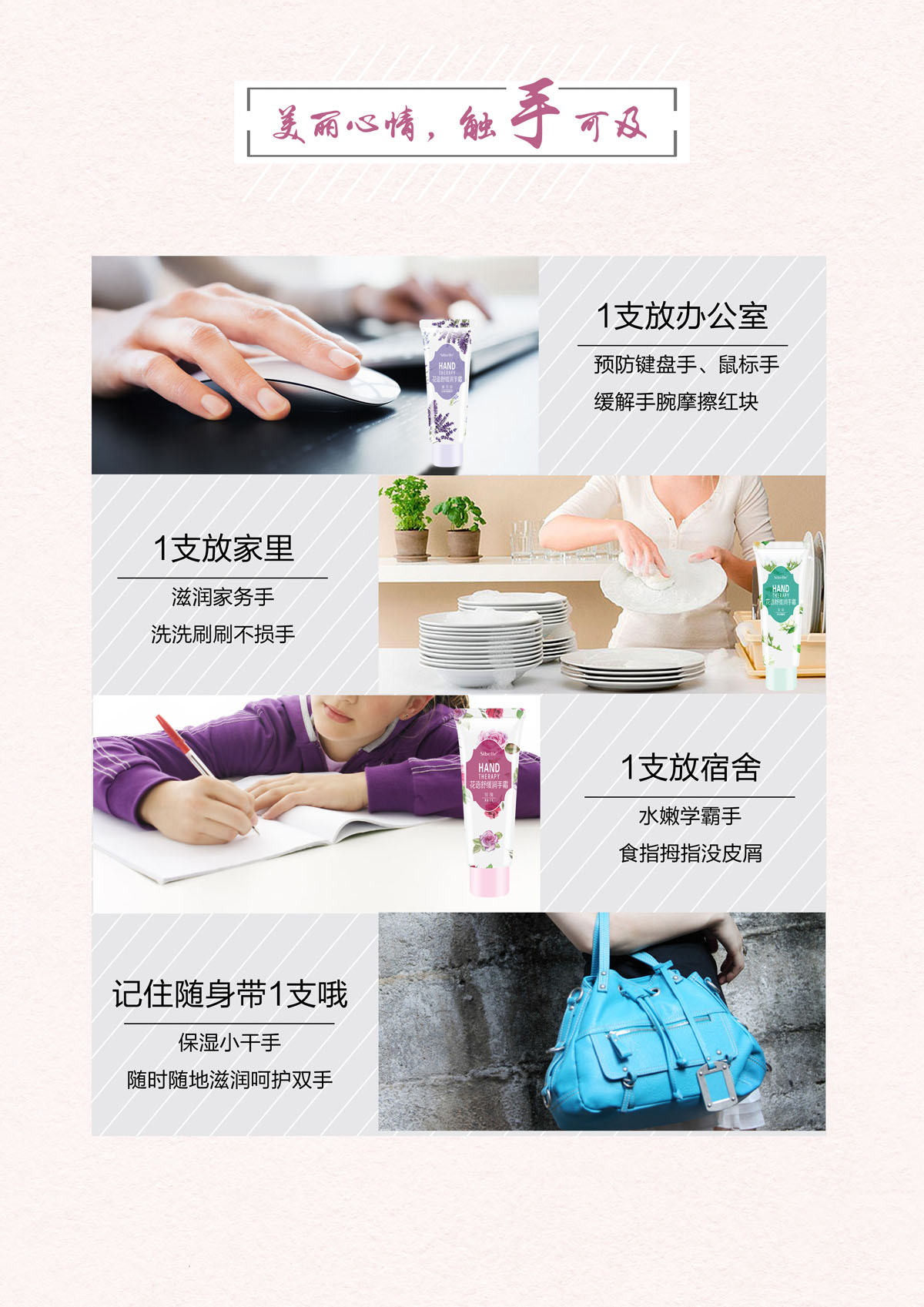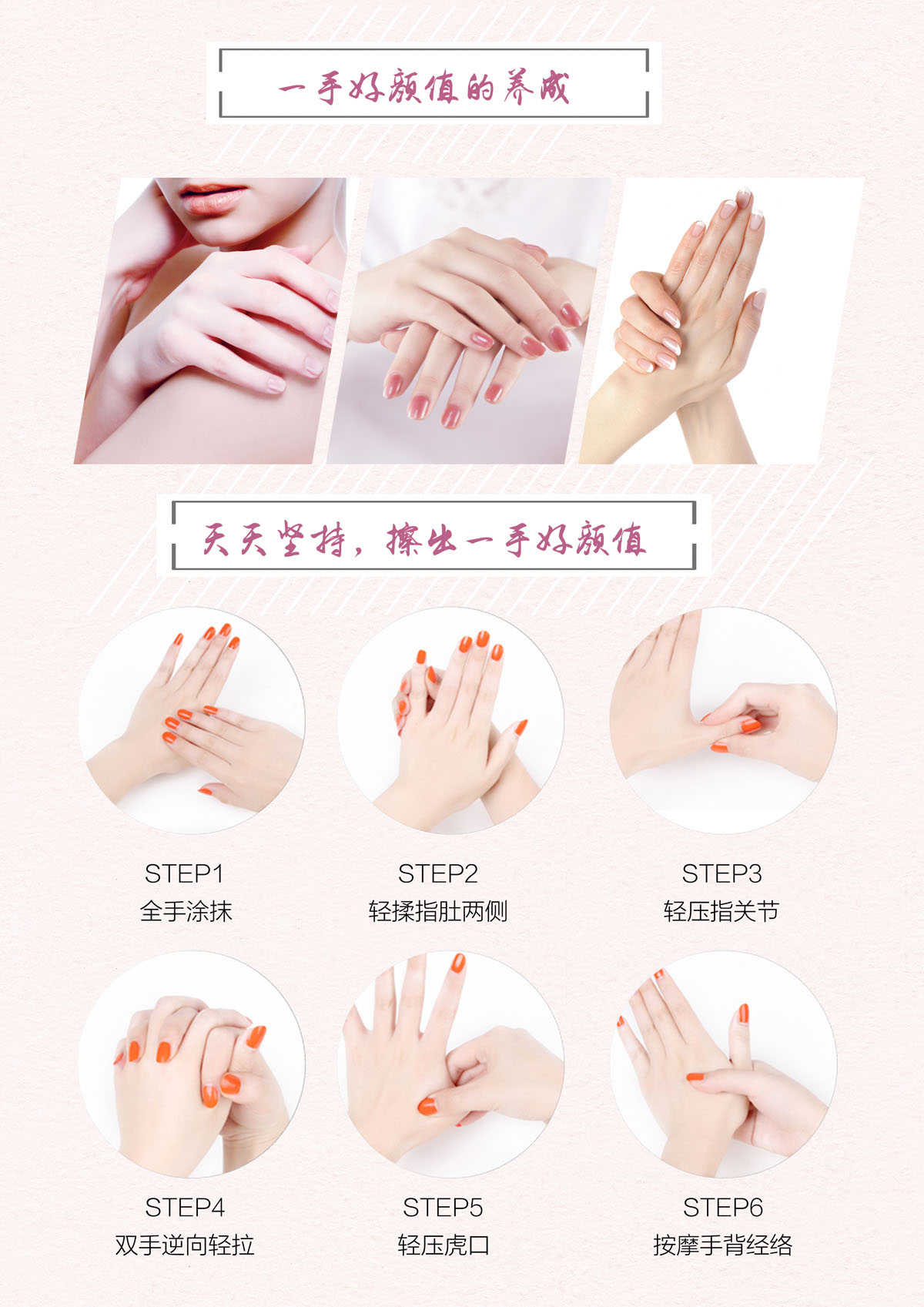 含有薰衣草萃取精华,滋养手部肌肤,舒缓干燥紧绷,改善粗糙,保护双手嫩滑有弹性; 不粘不腻,具有滑爽的使用感,亦可作手肘、膝盖及足踝的特别护理。