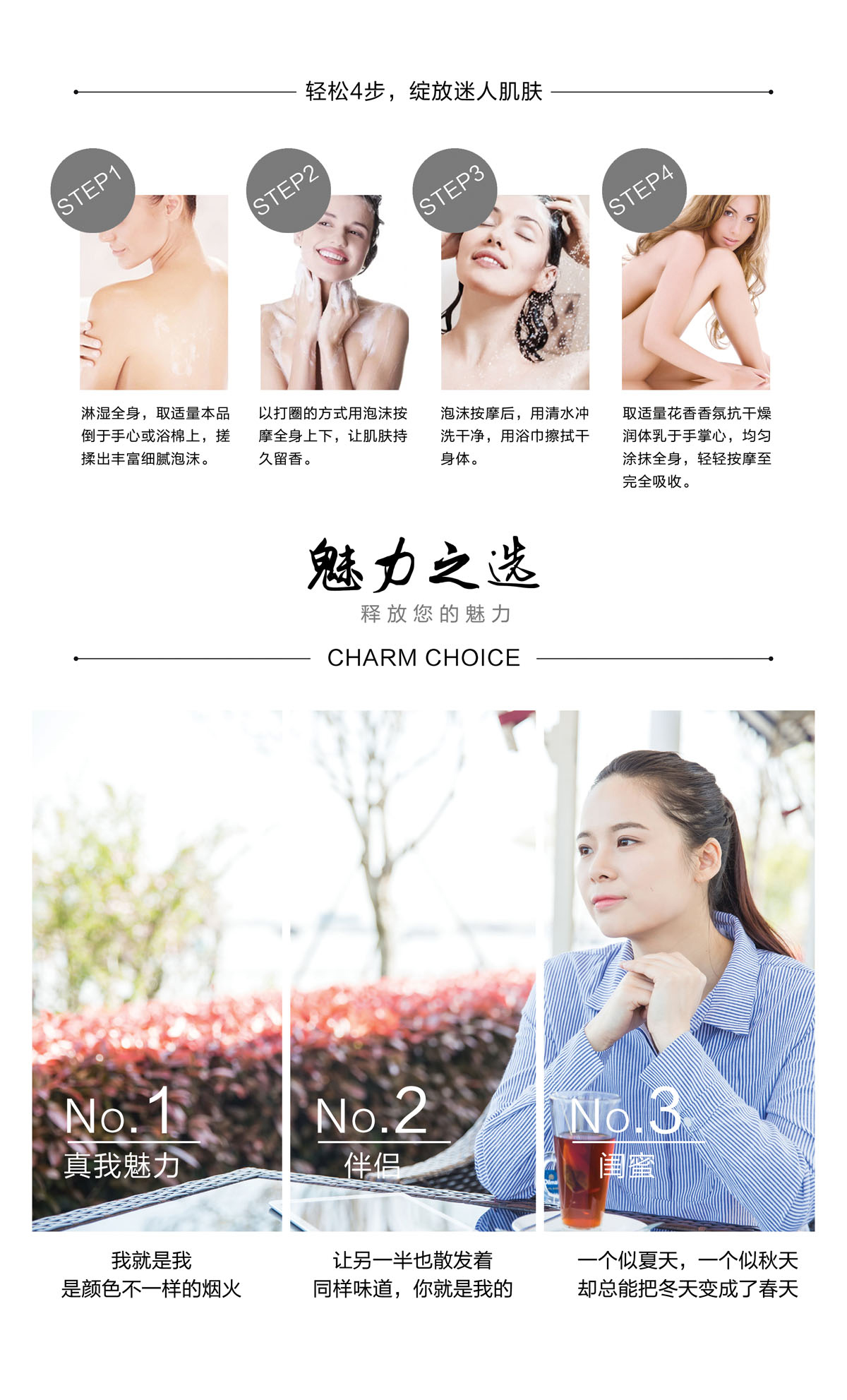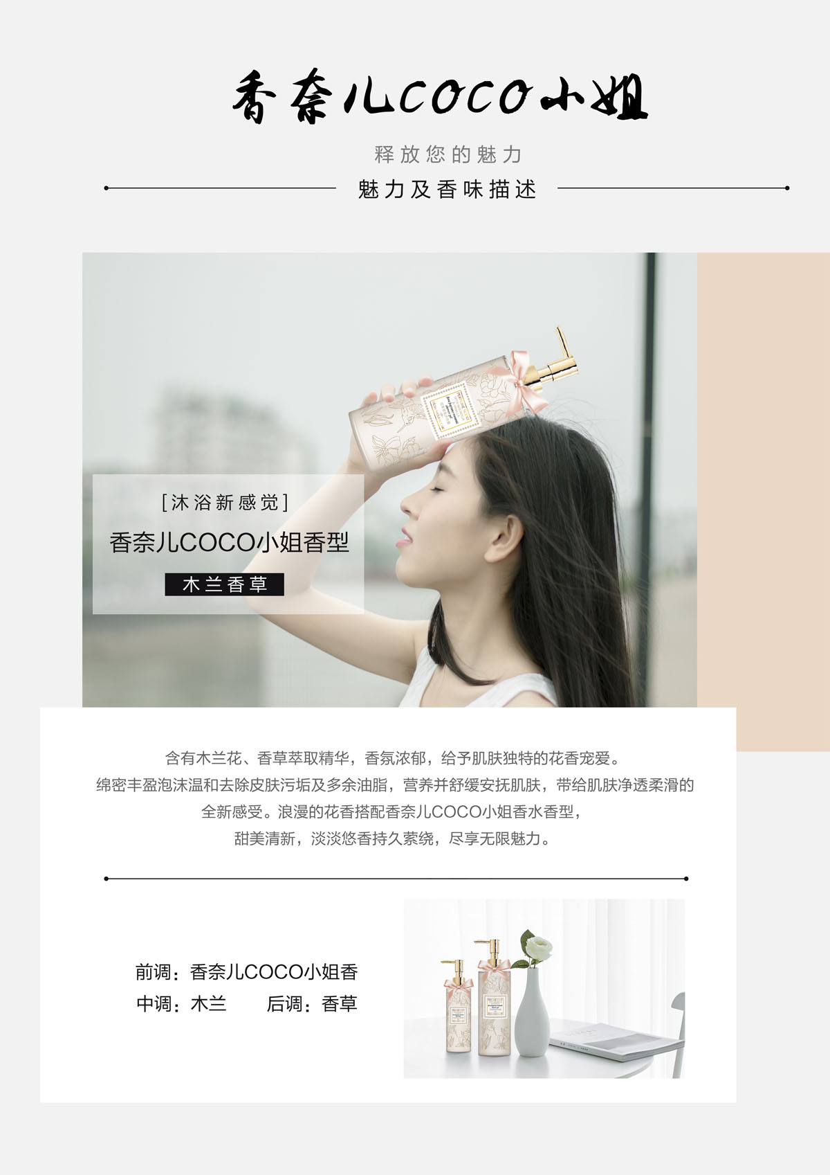 * 含有白玫瑰、莲花萃取精华,香氛浓郁,给予肌肤浪漫的花香宠爱。 * 绵细柔润的泡沫中带着极好的营养沁润肌肤,在肌肤表面形成保湿膜,浴后感觉肌肤柔嫩且不紧绷,一弹水澎澎。 * 浪漫的花香搭配香奈儿五号香水香型,香味优雅迷人,让你感受无边魅力。