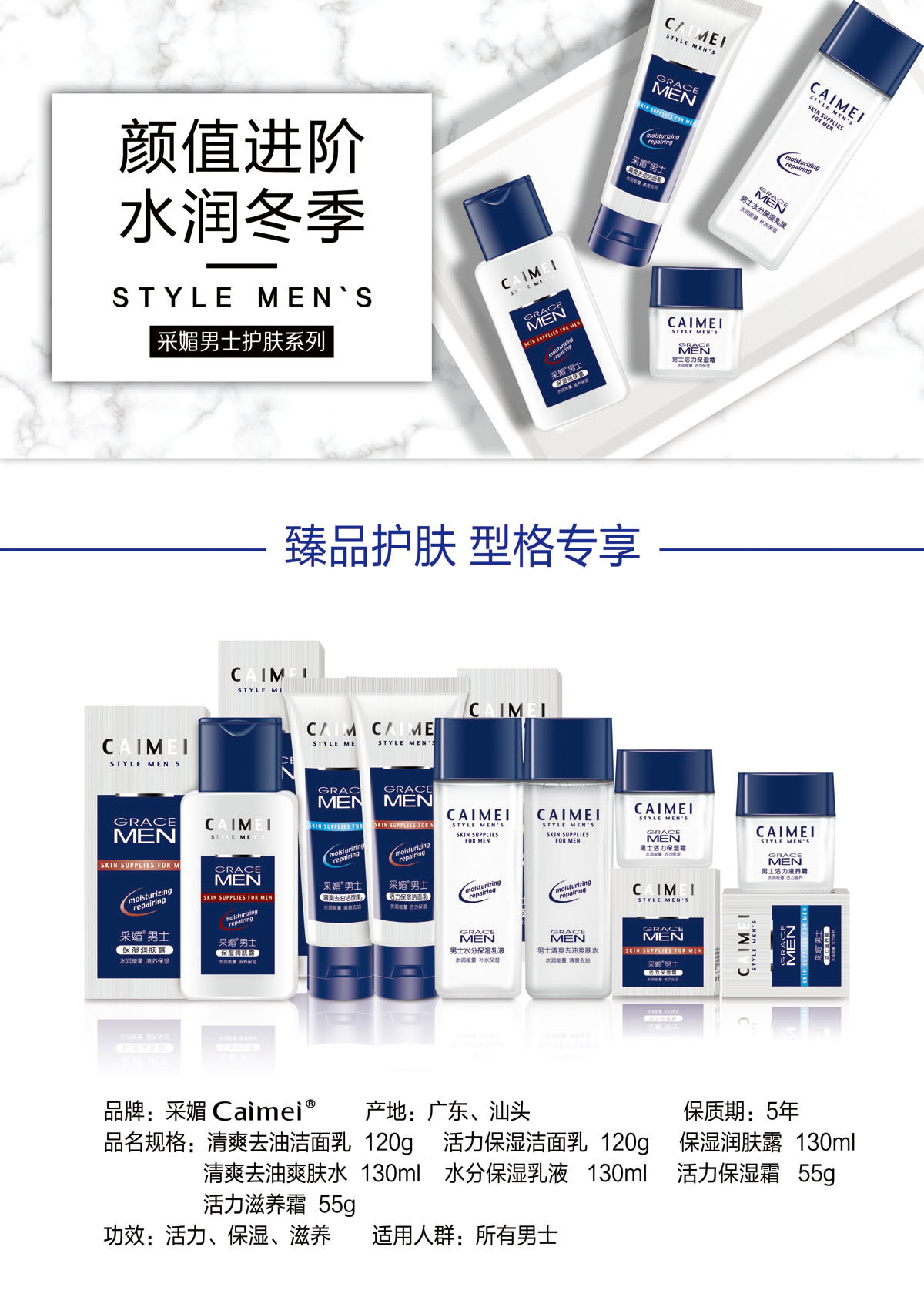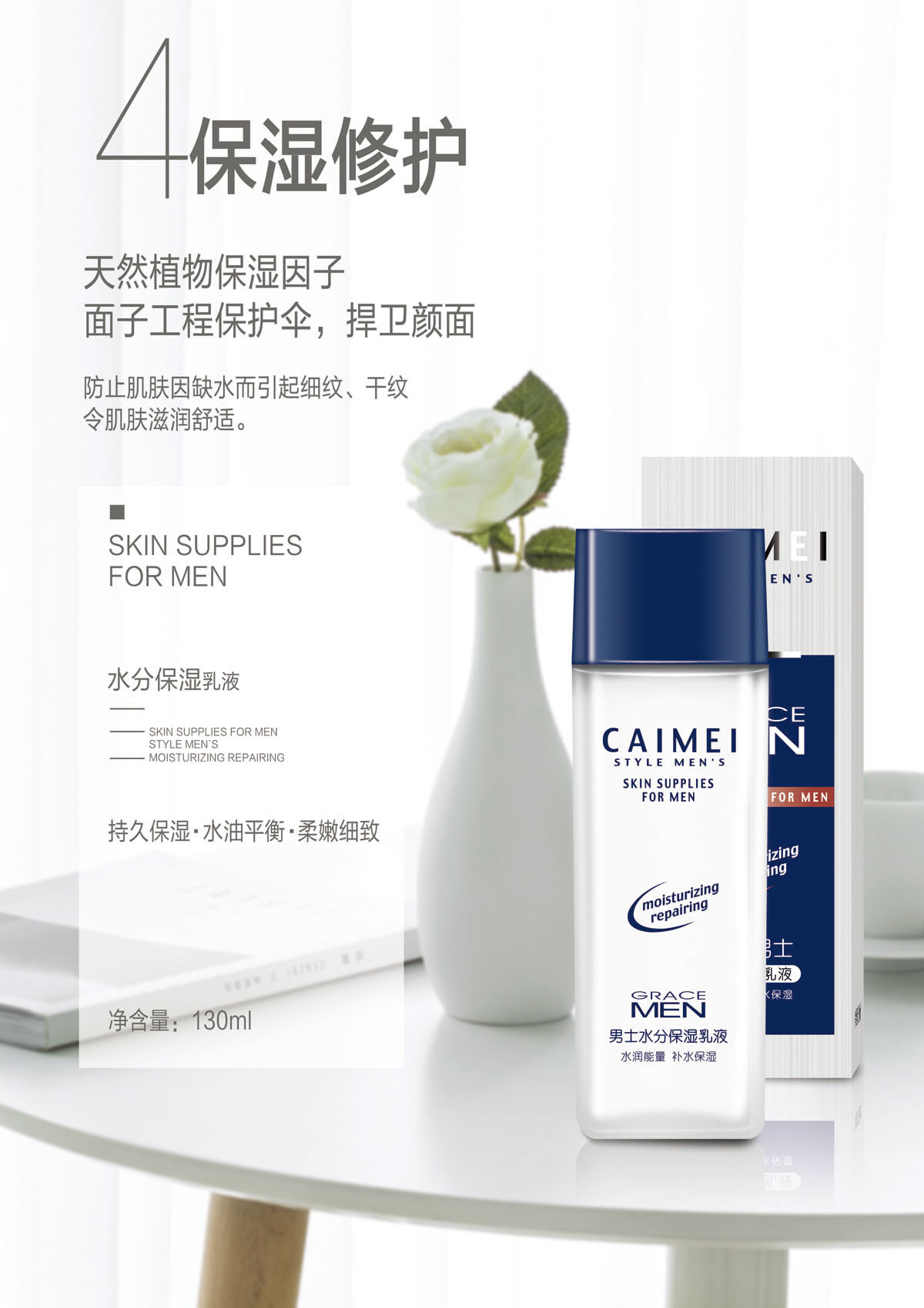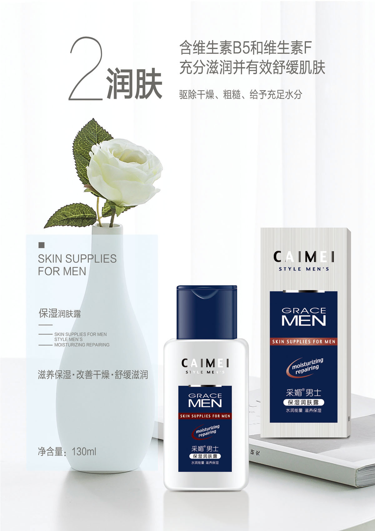 采媚男士保湿润肤露,蕴含金缕梅提取精华和芦荟保湿精华,源源补水,充分滋润并帮助缓解肌肤的干燥、粗糙及剃须后的不适感,减退细纹,令肌肤保持清爽舒适,柔润不紧绷。